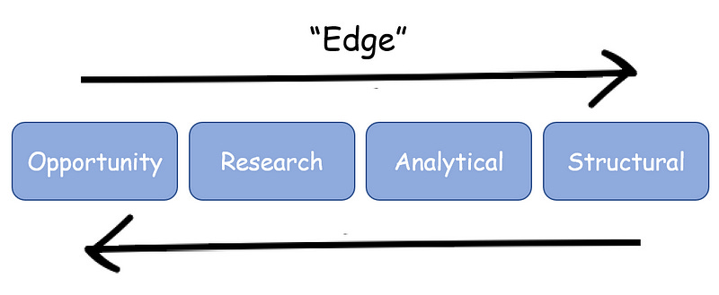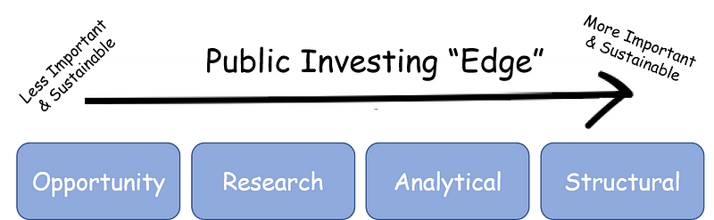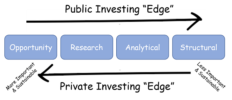 Jason had a philosophy that I really liked — the gist is, in public market investing you have 3 sources of edge, each one more important and sustainable than the last: research (access to information), analytical (what you do with that information), and structural (the amount of time you have to be right). I wanted to take a stab at unpacking that, and to add a fourth component, to see how his framework holds for private market investing.